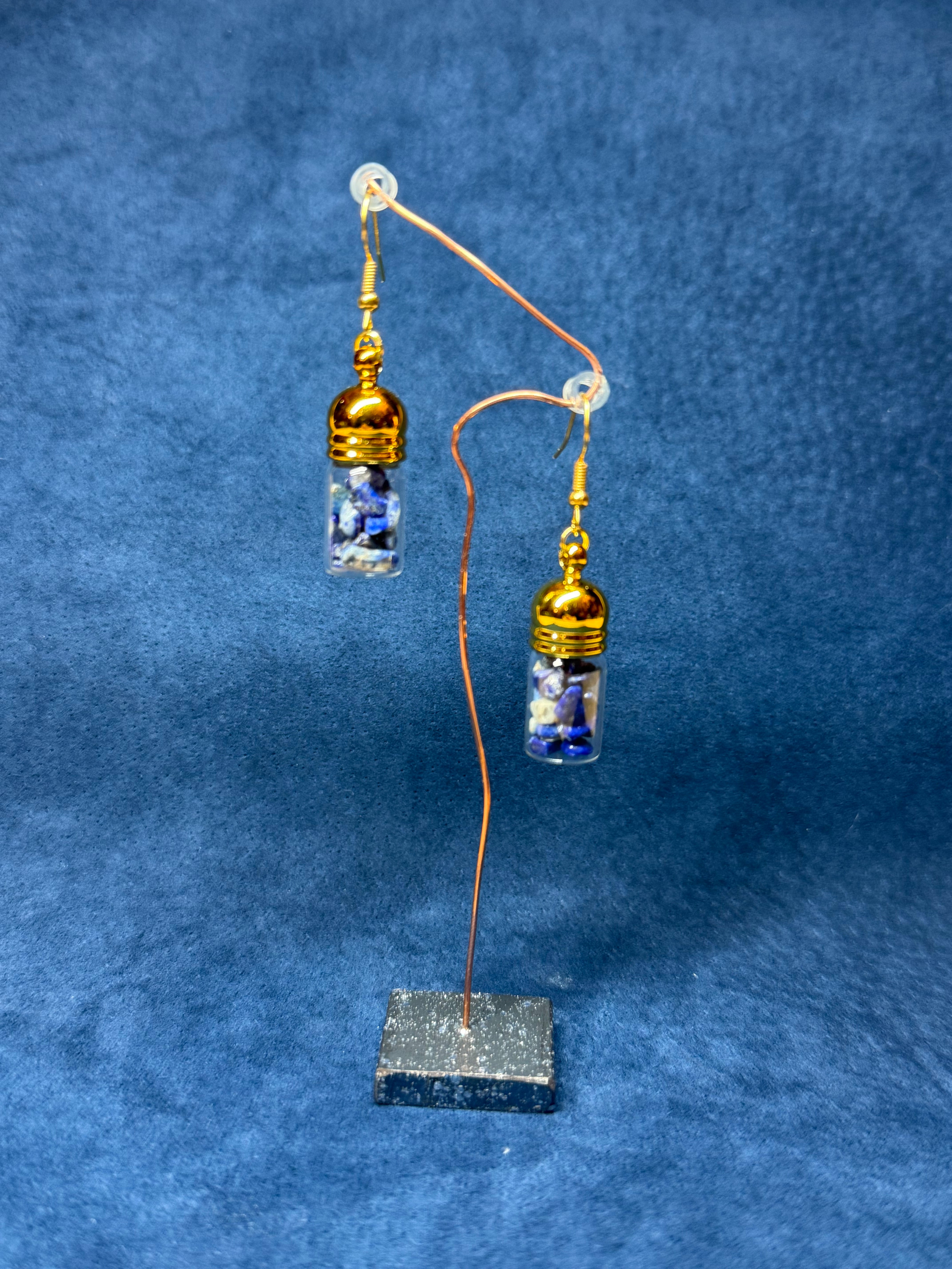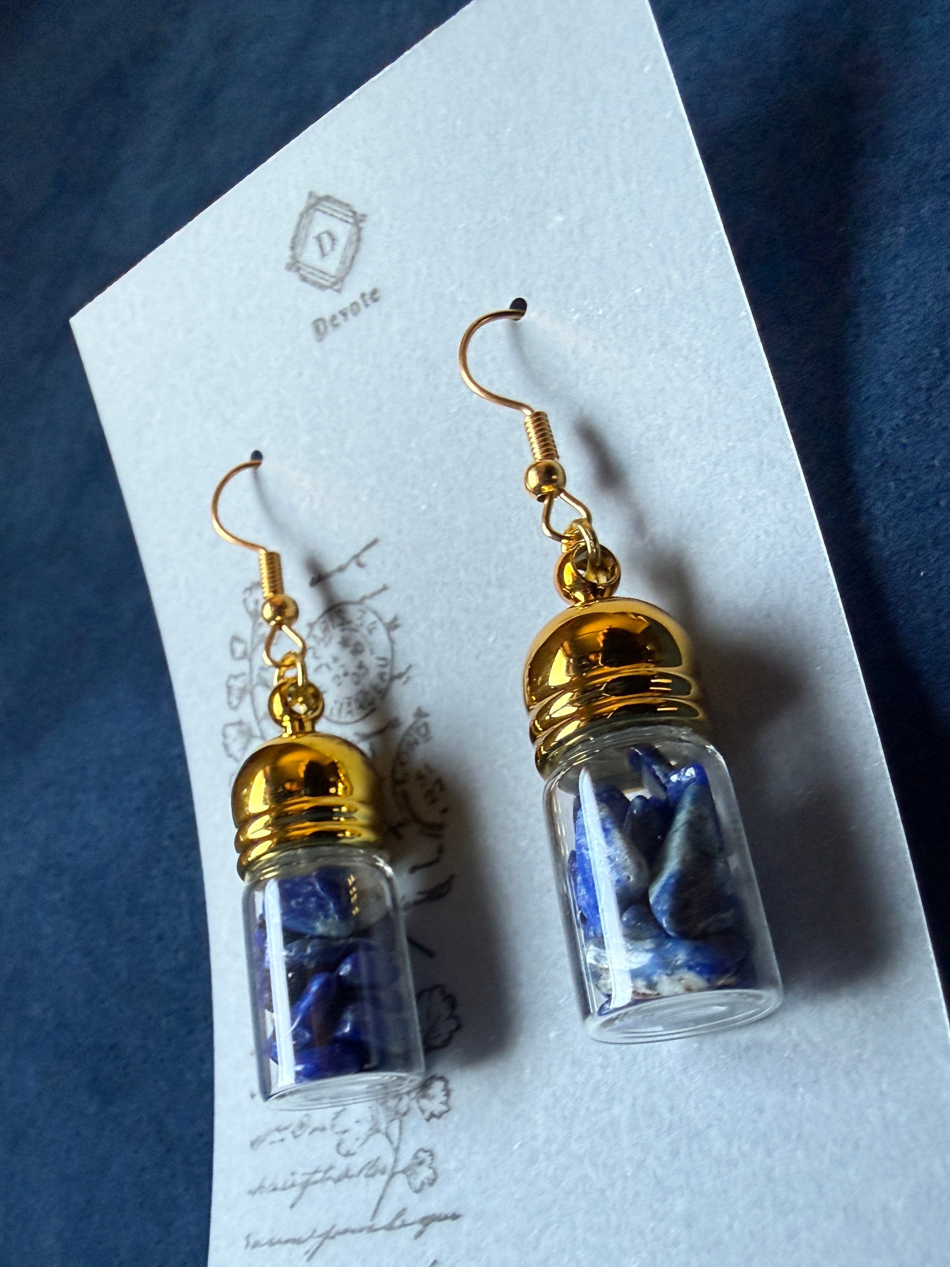 ラピスラズリを小瓶に閉じ込めたピアスです。
